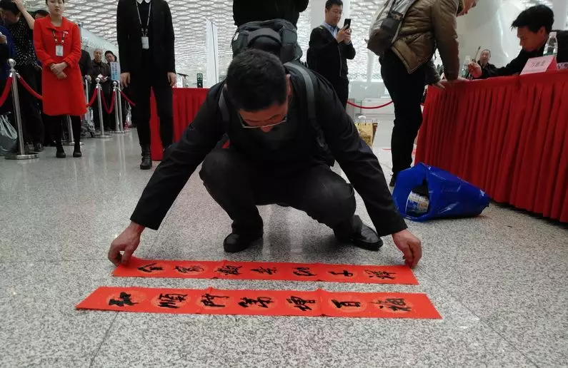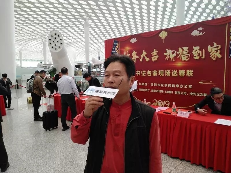 寶安區(qū)書法家協(xié)會主席李高揚介紹,在機場送春聯(lián)很有意義,可以給全國各地的朋友們送上新年祝福。這次深圳發(fā)布廳攜手深圳機場舉辦活動,寶安區(qū)書法家協(xié)會集結(jié)高手出動為群眾服務(wù),為市民送去祝福。他祝大家新春快樂,闔家幸福。