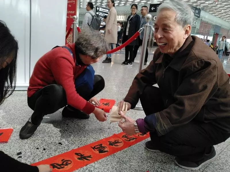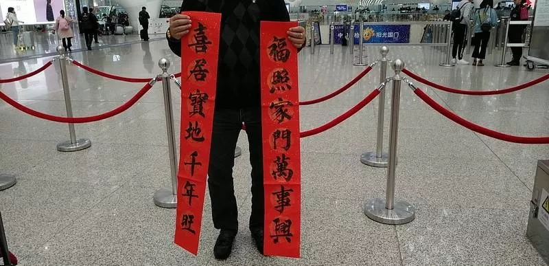 來領(lǐng)春聯(lián)的旅客里有國內(nèi)輾轉(zhuǎn)回老家的,有回國過年的,也有特地去國外過年的。來自江西婺源的曾老先生11點多的飛機飛往馬來西亞,今年他和老伴、孩子將在馬來西亞過年。他選的這兩幅春聯(lián)是他對新年的希望與祝福,將帶到馬來西亞貼起來,給新年增添年味兒?!拔疫€可以送給朋友,這是最好的禮物,他們一定會喜歡的?!痹壬吲d地說。