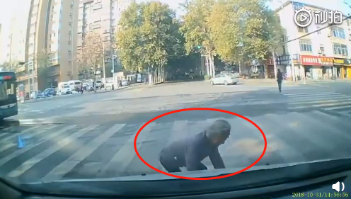 老太太走到小車(chē)正前方時(shí)卻突然停下腳步,緊接著緩緩臥倒在地。
