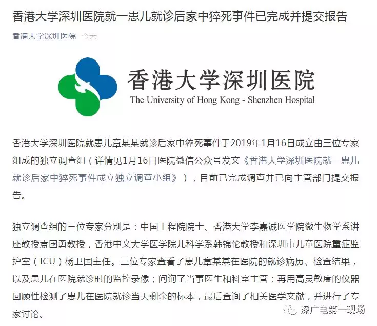 1月31日,香港大學(xué)深圳醫(yī)院再次發(fā)布消息,稱就患兒就診后家中猝死事件已完成調(diào)查并提交報告。全文如下: