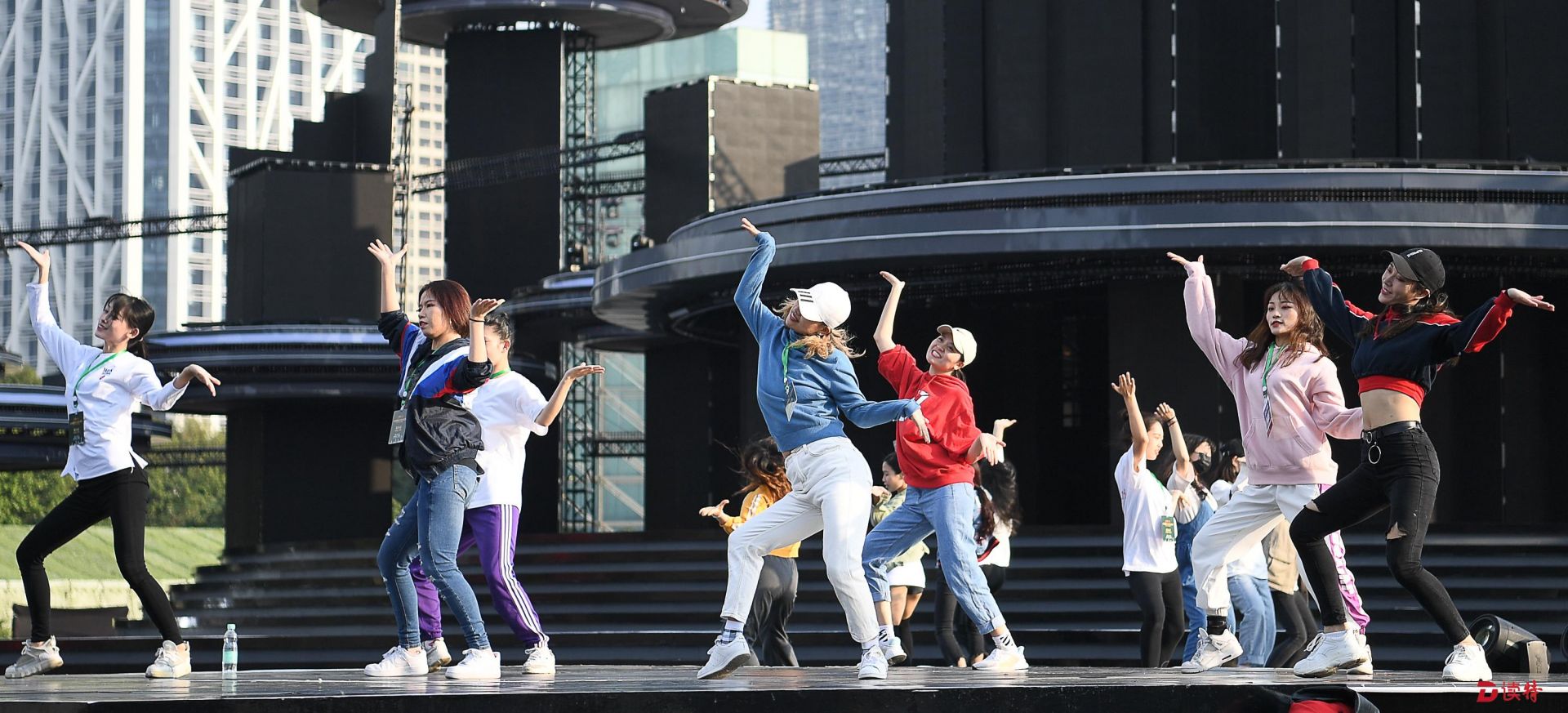 “你們的目光所及都是舞臺!”當記者當天下午來到市民中心廣場時彩排,分會場總導演孫濱指著搭建的主舞臺、舞臺前方的階梯和廣場、以及舞臺后方的高樓大廈這樣說。