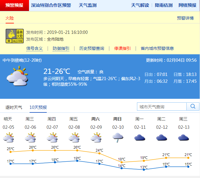 深圳新聞網(wǎng)2019年2月4日訊 深圳氣象局預計除夕至初一(4-5日)多云間陰天,間中偶有零星小雨和輕霧或霧,氣溫小幅波動,4日氣溫17-26℃;初二至初五(6-9日)暖濕氣流影響,多云間少云,早晚有輕霧或霧;初六(10日)前后受冷空氣影響,伴有小雨,氣溫下降。