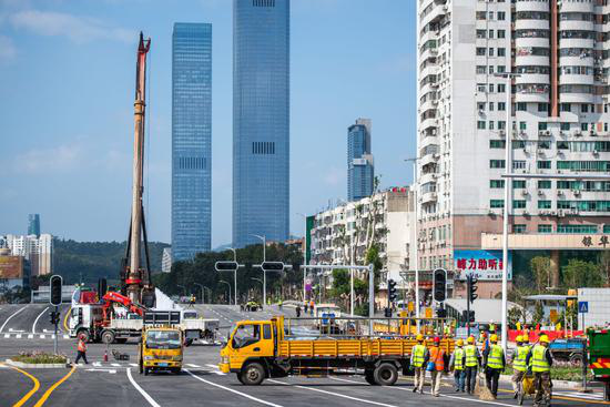 記者在現(xiàn)場(chǎng)看到吊車正在調(diào)運(yùn)施工物資。