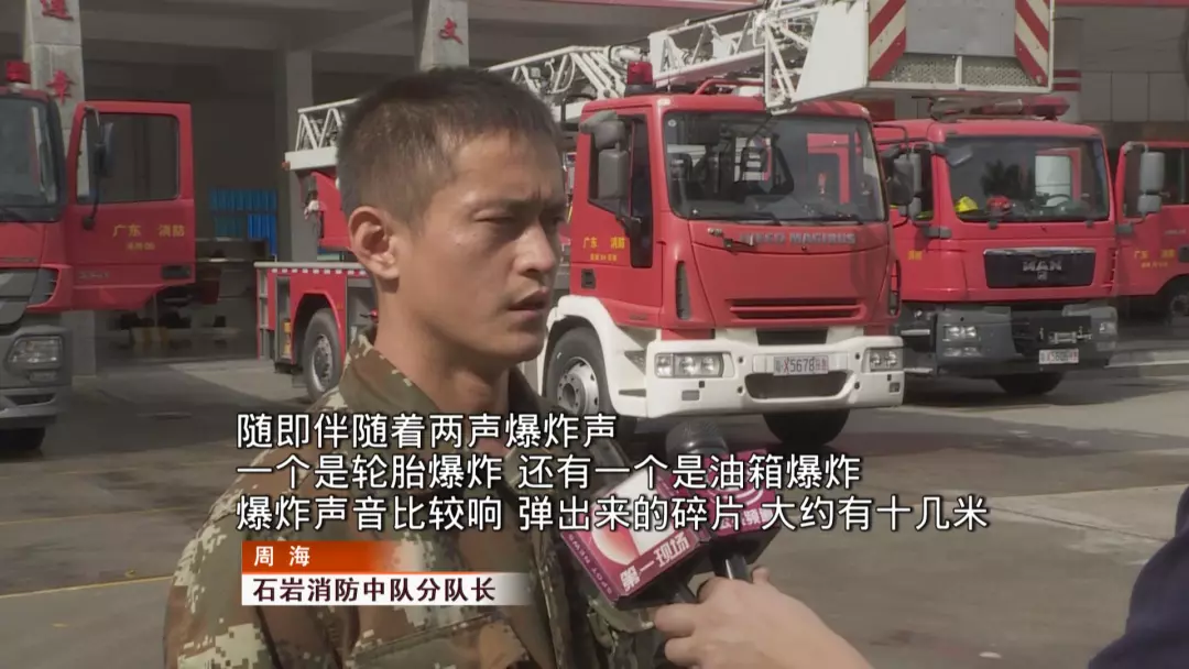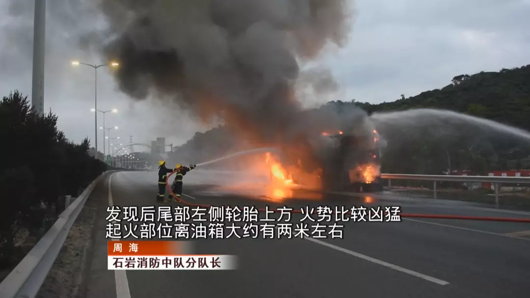 由于陳小姐及時報警,石巖消防中隊官兵在起火不久后便到達(dá)現(xiàn)場。到場后,消防立即要求還在救火的兩名司機撤離。