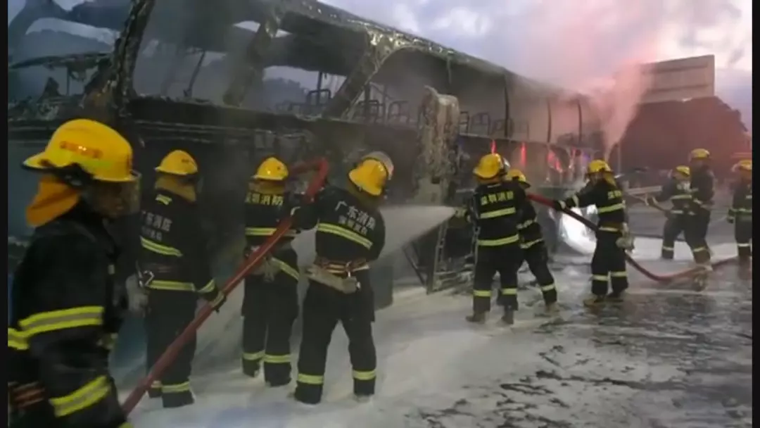 通過泡沫滅火劑覆蓋的方式,火勢最終得到控制,但整個大巴也被燒的只剩下框架。車上的兩名司機(jī)介紹,他們從桂林發(fā)車來到深圳,因為剛剛在附近車站下客,車上并無乘客。而起火原因兩人也并不清楚。