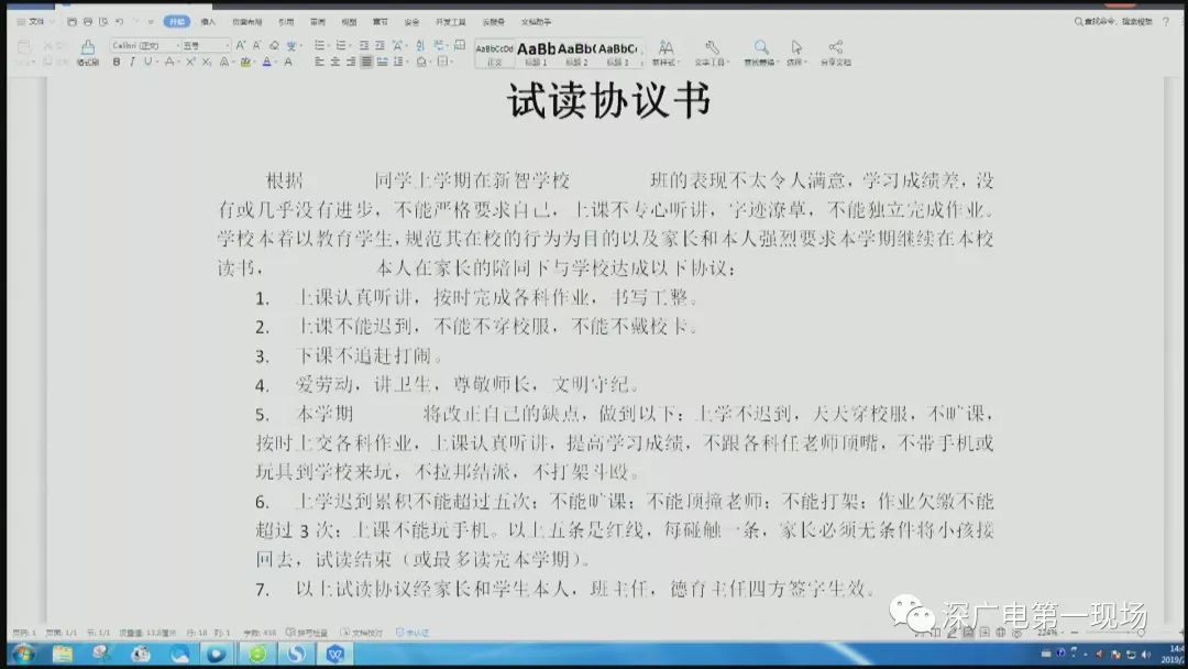 這份《試讀協(xié)議書(shū)》的大概內(nèi)容如下:由于某某同學(xué)上學(xué)期表現(xiàn)不令人滿意,學(xué)習(xí)成績(jī)差,沒(méi)有或幾乎沒(méi)有進(jìn)步,不能?chē)?yán)格要求自己。學(xué)生在家長(zhǎng)的陪同下與學(xué)校達(dá)成以下協(xié)議。協(xié)議第六條注明:上學(xué)遲到累計(jì)不能超過(guò)5次;不能曠課;不能頂撞老師;不能打架;作業(yè)欠繳不能超過(guò)3次;上課不能玩手機(jī)。以上條款是紅線,每觸碰一條,家長(zhǎng)必須無(wú)條件將小孩接回去,試讀結(jié)束?;蛘咦疃嘧x完本學(xué)期。