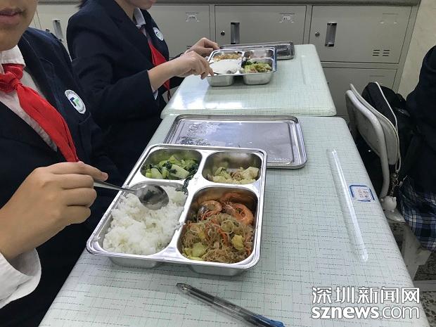 18日上午12點(diǎn)下課鈴聲一過(guò),深圳市福田外國(guó)語(yǔ)學(xué)校南校區(qū)(以下簡(jiǎn)稱”福外南校區(qū)“)的同學(xué)陸續(xù)走出學(xué)校,留在校內(nèi)午餐午托的同學(xué)則安靜的坐在位置上,等待當(dāng)日值班的同學(xué)將準(zhǔn)備好的餐盒分發(fā)到每個(gè)同學(xué)桌上。記者了解到,福外南校區(qū)是2018年秋季新開(kāi)辦的公辦學(xué)校,從上學(xué)期飯?zhí)媒ê煤?,學(xué)校就組織了飯?zhí)媒?jīng)營(yíng)方和家長(zhǎng)代表就供餐價(jià)格、樣式、品質(zhì)等展開(kāi)廣泛而深入的討論、協(xié)商。最終確定學(xué)生的膳食為20元,包含三葷一素,提供湯、水果及點(diǎn)心,不僅搭配得當(dāng),更注重營(yíng)養(yǎng)均衡。