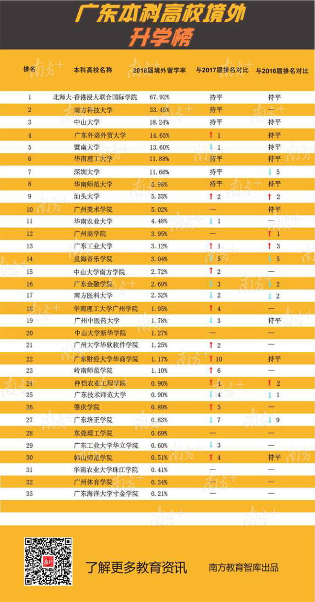 廣東外語外貿(mào)大學(xué)境外留學(xué)人數(shù)顯著提升,2018屆共有275人升入世界排名前100名的高校深造。兩所內(nèi)地與香港合作創(chuàng)辦的大學(xué)在境外留學(xué)率上處于全省前列。北京師范大學(xué)-香港浸會大學(xué)聯(lián)合國際學(xué)院持續(xù)多年保持全省第1位,此次共有811人留學(xué),其中481人就讀世界前100名的大學(xué)。香港中文大學(xué)(深圳)僅公布總升學(xué)率65.67%,該校就業(yè)處相關(guān)負責(zé)人介紹,升學(xué)率中絕大部分是境外留學(xué),176名學(xué)生平均每人收到3份世界知名大學(xué)錄取通知書。
