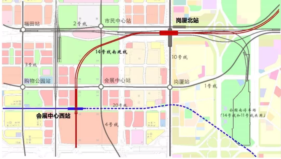 14號(hào)線南延從崗廈北站后折返線中部引出,下穿11號(hào)線右線和向南下穿市民中心南廣場(chǎng),下穿4號(hào)線,下穿1號(hào)線至?xí)怪行脑O(shè)會(huì)展中心站,與規(guī)劃20號(hào)線換乘。線路全長(zhǎng)約1.3公里,采用地下敷設(shè)。