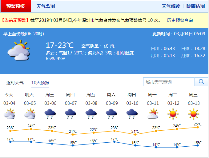 據(jù)市氣象臺(tái)消息,今天,深圳多云到陰天;氣溫17-19℃;相對(duì)濕度75%-95%;能見(jiàn)度普遍在10公里以上。受冷空氣影響早晨氣溫較昨天下降3-4℃,天氣清涼,注意及時(shí)添加衣物。  5日多云,部分時(shí)間可見(jiàn)陽(yáng)光;6-10日冷暖空氣交替影響,云量較多,降雨頻繁,間中有雷雨,天氣清涼。