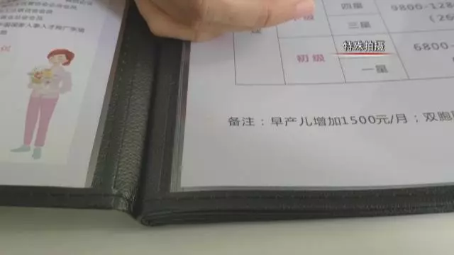 這家家政公司把核心業(yè)務直接鎖定在月嫂服務,看到有顧客前來,工作人員稱公司剛剛換了新的價格牌。價格單顯示,月嫂一般工作周期為26天,初級月嫂即一星二星級,薪資從6800到9800,金牌服務則在12800到2萬元。