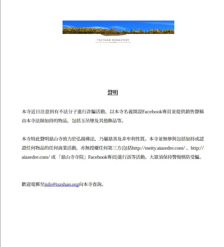 警方同時(shí)向深晚提供的證據(jù)中,還有一份香港某知名寺院的聲明。聲明中說(shuō):"本寺近日注意到有不法分子進(jìn)行詐騙活動(dòng),以本寺名義開(kāi)設(shè) Facebook專(zhuān)頁(yè)并提供銷(xiāo)售聲稱由本寺法師加持的物品,包括玉吊墜及其他物品等。本寺特此聲明,本寺并無(wú)參與加持或認(rèn)證任何物品的任何商業(yè)活動(dòng),亦無(wú)授權(quán)任何第三方進(jìn)行該等活動(dòng)。大眾須保持警惕慎防受騙。"