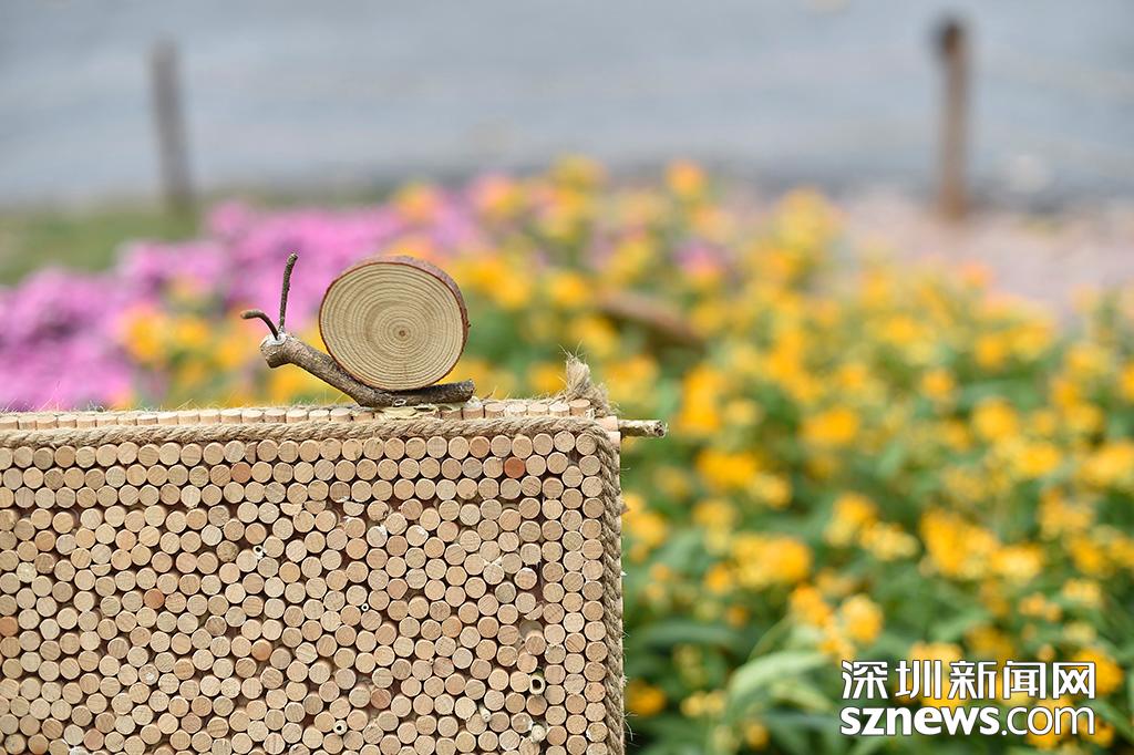 由木頭設(shè)計(jì)的“木頭蝸?!秉c(diǎn)綴在花海中