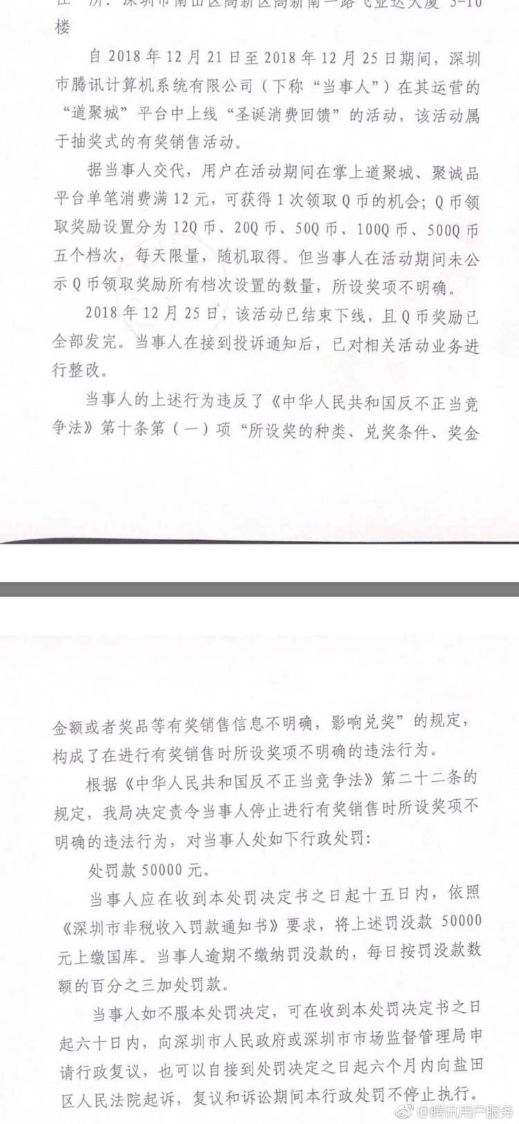 為解答網(wǎng)友疑惑,當(dāng)天晚間,微博賬號騰訊用戶服務(wù)公開發(fā)布了該處罰決定書,決定書中提到,2018年12月21日 -25日期間,深圳市騰訊計算機(jī)系統(tǒng)有限公司(下稱"當(dāng)事人")在其運營的"道聚城"平臺中上線"圣誕消費回饋"的活動,該活動屬于抽獎式的有獎銷售活動。