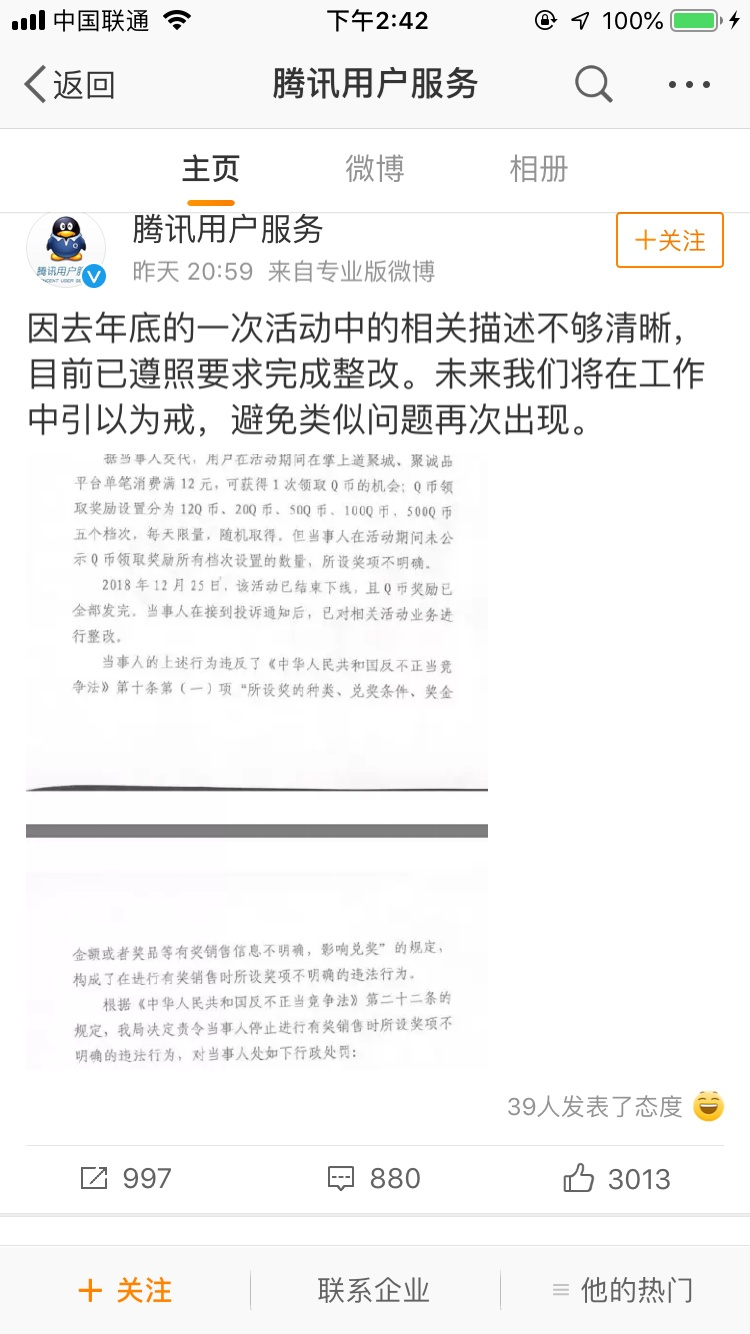 3月20日,微博認(rèn)證為騰訊公司公關(guān)總監(jiān)張軍在微博中解釋:因去年年底的一次活動中的相關(guān)描述不夠清晰,目前已遵照要求完成整改。未來我們將在工作中引以為戒,避免類似問題再次出現(xiàn)。
