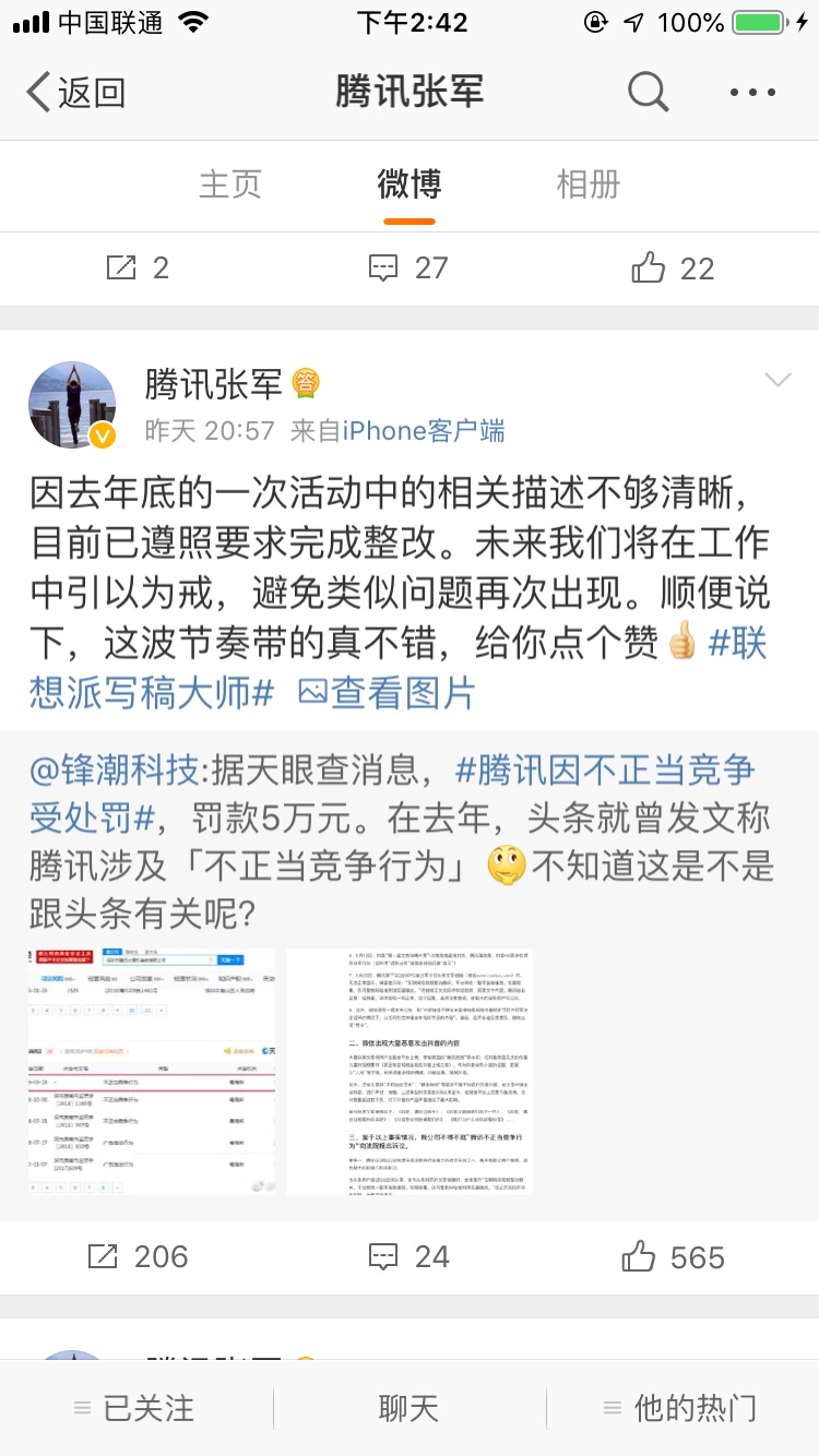 數(shù)據(jù)顯示,騰訊在前兩次受到行政處罰的類型均為不正當(dāng)競爭。微博賬號 @鋒潮科技發(fā)文稱,去年,今日頭條就曾發(fā)文稱騰訊設(shè)計不正當(dāng)競爭行為,不知道這是不是跟頭條有關(guān)。對該揣測,張軍還在微博中調(diào)侃工作人員不早公布緣由,導(dǎo)致該事件被人帶節(jié)奏。