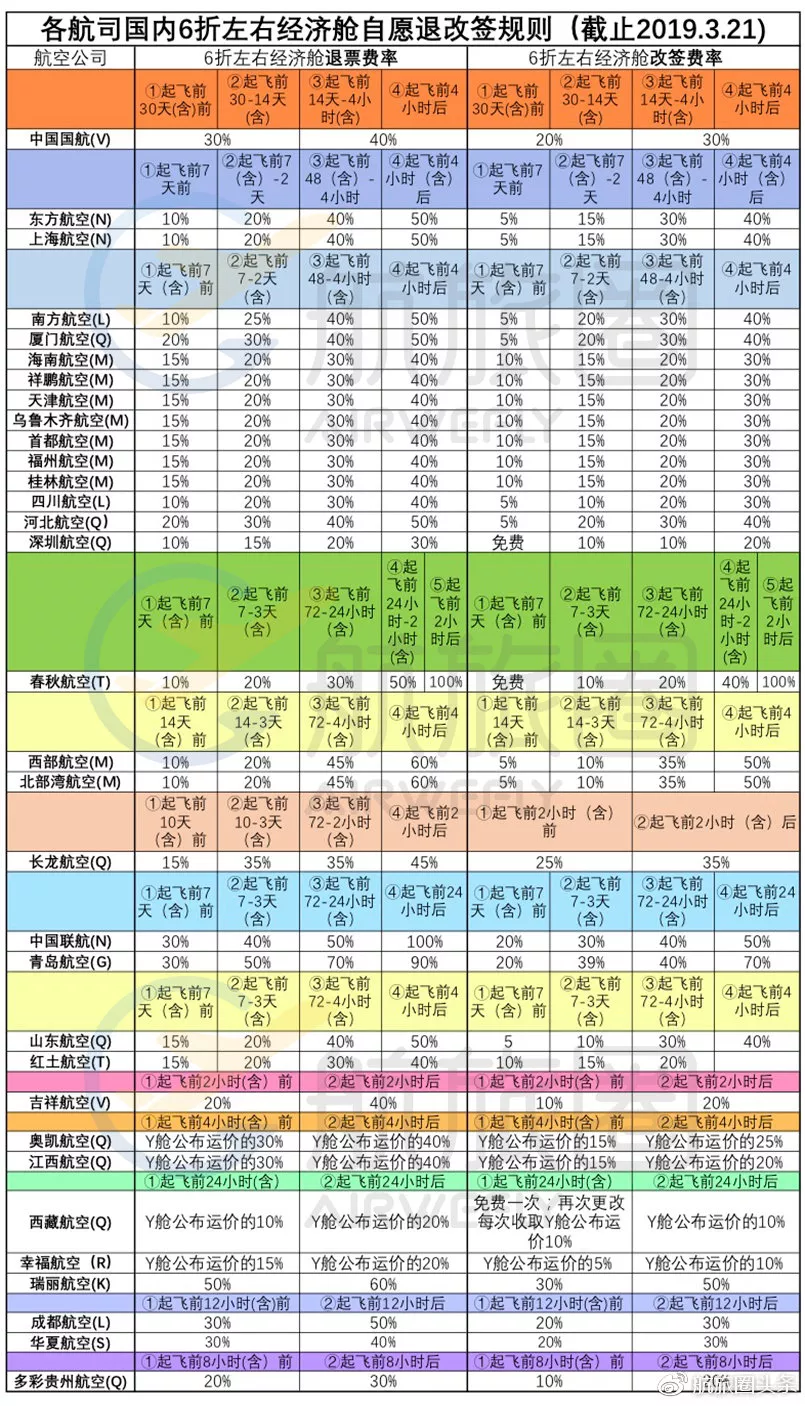 具體每家航司收取多少退改簽手續(xù)費(fèi),可以詳見下方表格↓↓↓