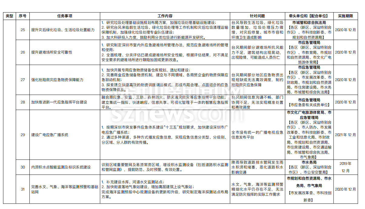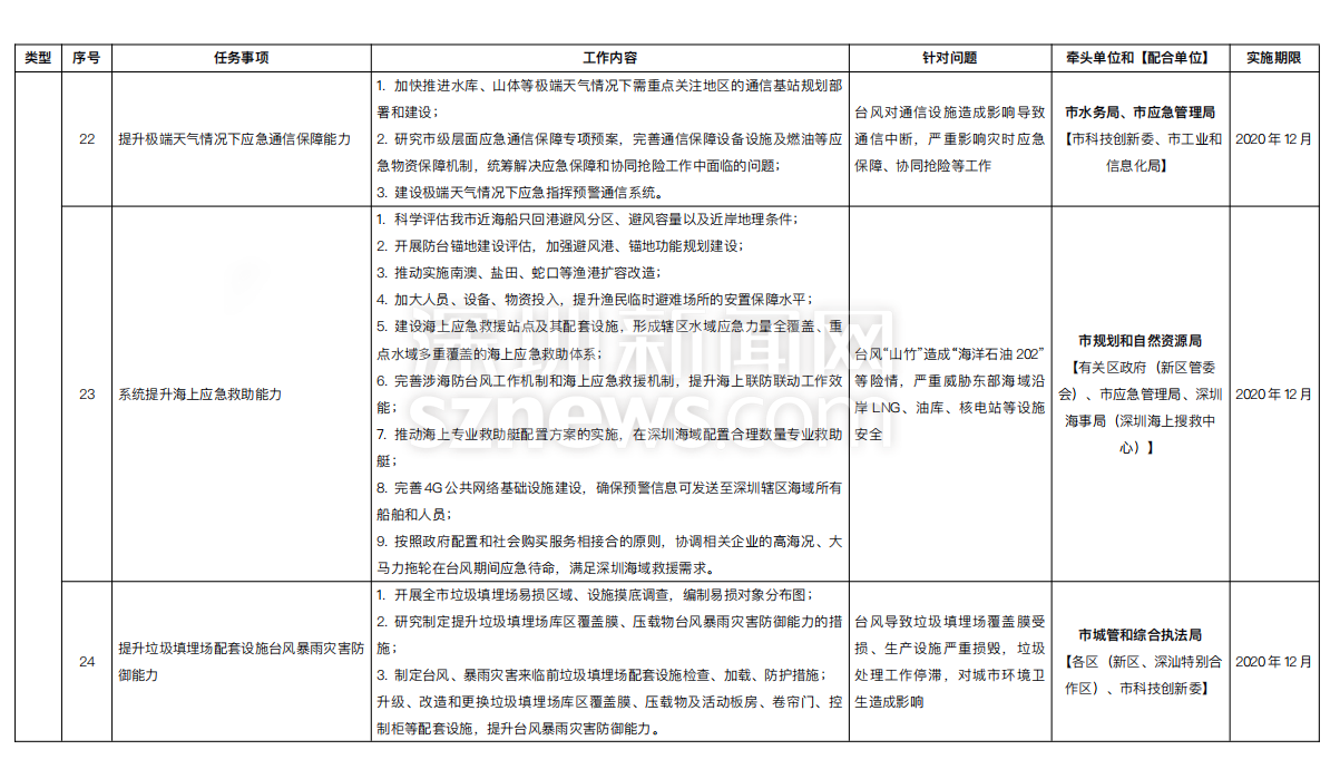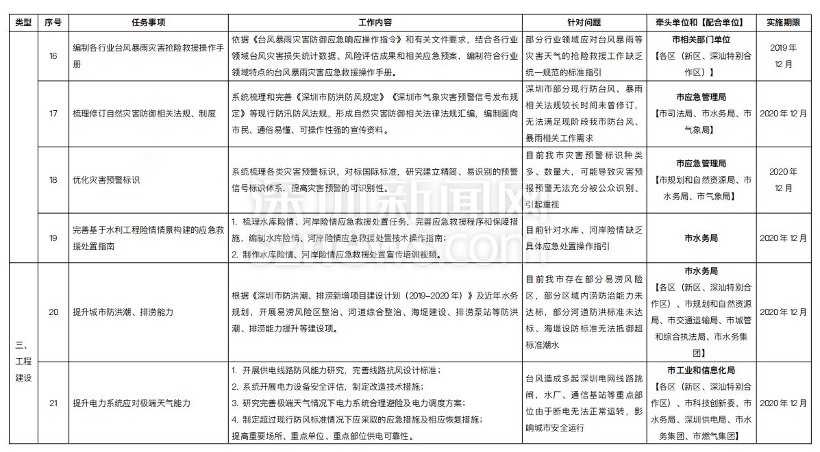 附:《深圳市提升臺(tái)風(fēng)暴雨災(zāi)害防御能力重點(diǎn)任務(wù)實(shí)施方案一覽表》