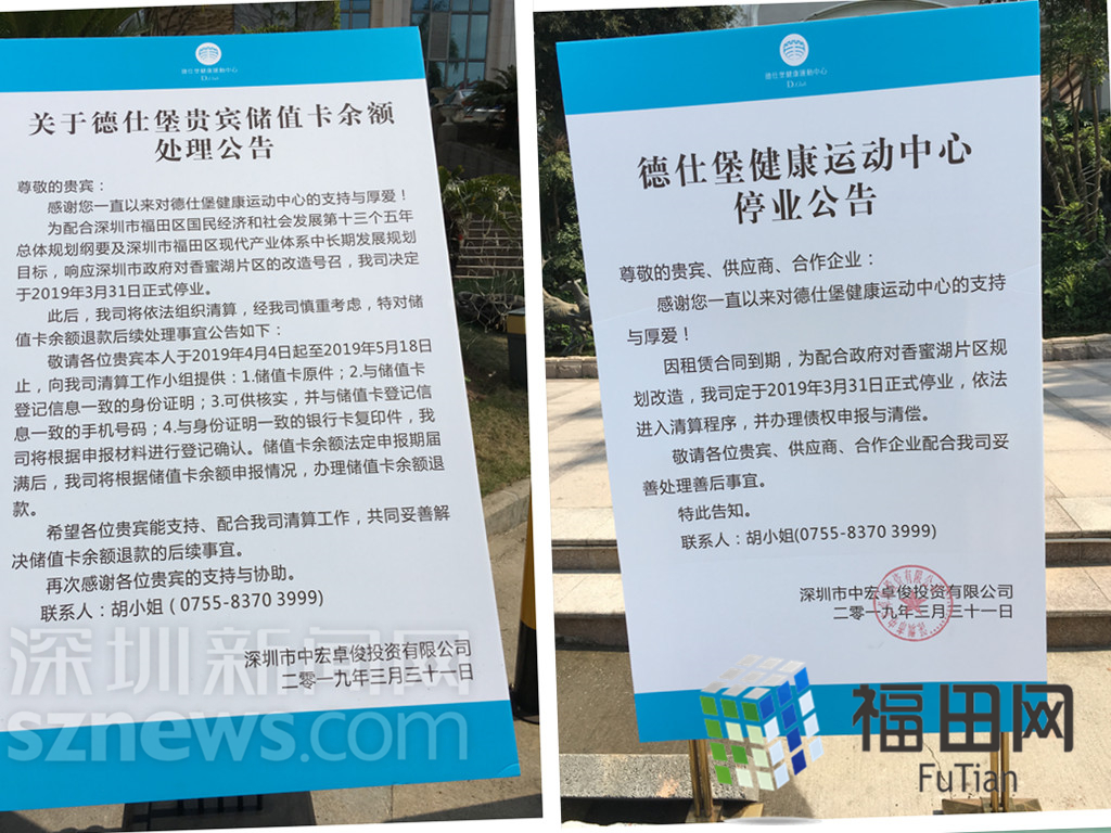 公告牌顯示,因租賃合同到期,為配合政府對(duì)香蜜湖片區(qū)規(guī)劃改造,德仕堡健康運(yùn)動(dòng)中心定于2019年3月31日正式停業(yè)。