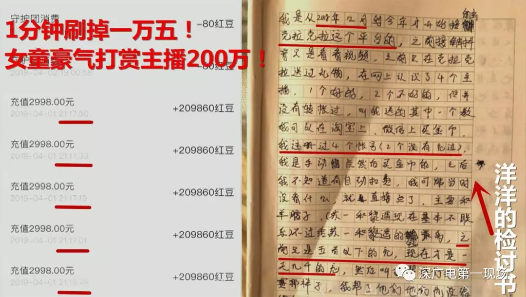 深廣電第一現(xiàn)場2019年4月12日訊 這兩天《第一現(xiàn)場》報道了11歲女童洋洋打賞某直播平臺主播近200萬!家長要求她寫了一份檢討書……