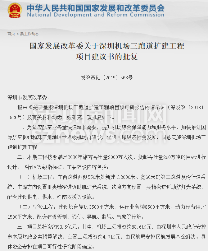 國家發(fā)展改革委關(guān)于深圳機(jī)場三跑道擴(kuò)建工程項目建議書的批復(fù)截圖