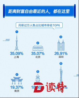深圳特區(qū)報2019年4月23日訊 月薪過萬人數(shù)占比城市排名 TOP6:上海、北京、深圳、南京、杭州、廣州;其中,北上廣深受訪者中月薪在5000至8000元人數(shù)居多;薪酬水平最高的三個行業(yè)分別是:互聯(lián)網(wǎng)、房地產(chǎn)、金融;受訪者中工作10年月薪過萬人數(shù)不足三成、過六成受訪者工資不及預(yù)期、逾七成受訪者因為工資考慮跳槽;五成受訪者用于理財?shù)腻X不足工資20%、近五成受訪者在第三方互聯(lián)網(wǎng)理財平臺進行工資理財。