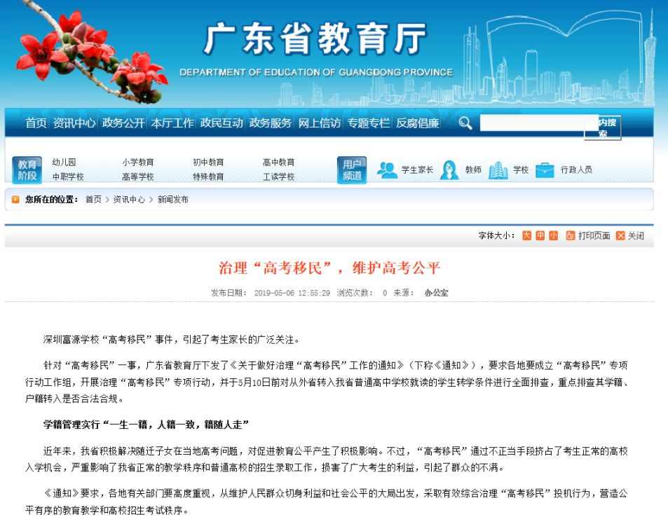 廣東省教育廳日前下發(fā)了《關(guān)于做好治理“高考移民”工作的通知》,要求各地成立“高考移民”專項(xiàng)行動(dòng)工作組,開(kāi)展治理“高考移民”專項(xiàng)行動(dòng),并于5月10號(hào)前對(duì)從外省轉(zhuǎn)入廣東省普通高中學(xué)校就讀的學(xué)生轉(zhuǎn)學(xué)條件進(jìn)行全面排查。廣東省教育考試院副院長(zhǎng)范韶彬表示,要求各地教育行政部門要重點(diǎn)發(fā)現(xiàn)和糾正人籍分離、空掛學(xué)籍、學(xué)籍造假現(xiàn)象,對(duì)違規(guī)招收的“在冊(cè)不在校”、“在校不在籍”的學(xué)生,要及時(shí)清退。