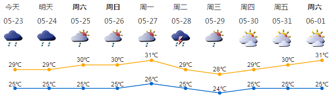 我市陰天間多云,有陣雨,部分時間雨勢較大;氣溫25-29℃;東南風2-3級;相對濕度65%-95%