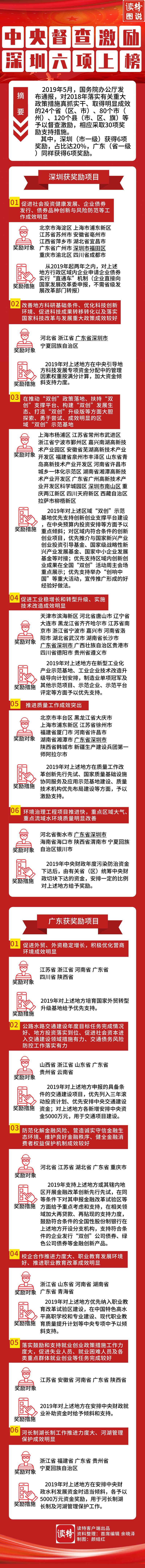 2019年5月,國務院辦公廳發(fā)布通報,對2018年落實有關重大政策措施真抓實干、取得明顯成效的24個?。▍^(qū)、市)、80個市(州)、120個縣(市、區(qū)、旗)等予以督查激勵,相應采取30項獎勵支持措施。其中,深圳(市一級)獲得6項獎勵,占比達20%,廣東(省一級)同樣獲得6項獎勵。