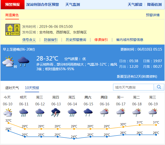 深圳新聞網(wǎng)2019年6月10日訊 在近幾日副熱帶高壓的影響下,深圳迎來了久違的“深圳藍(lán)”。不過,市民們在享受通透的藍(lán)天夏日的同時(shí),也承受著不斷升溫的“燒烤模式”。2019年6月6日上午09時(shí)15分深圳市氣象臺發(fā)布了今年的首個(gè)高溫黃色預(yù)警信號,2019年6月9日羅湖區(qū)東門自動站記錄到36.2℃高溫。氣溫圖上一片橙色紅色,簡直成了一只“紅燒雞腿”。