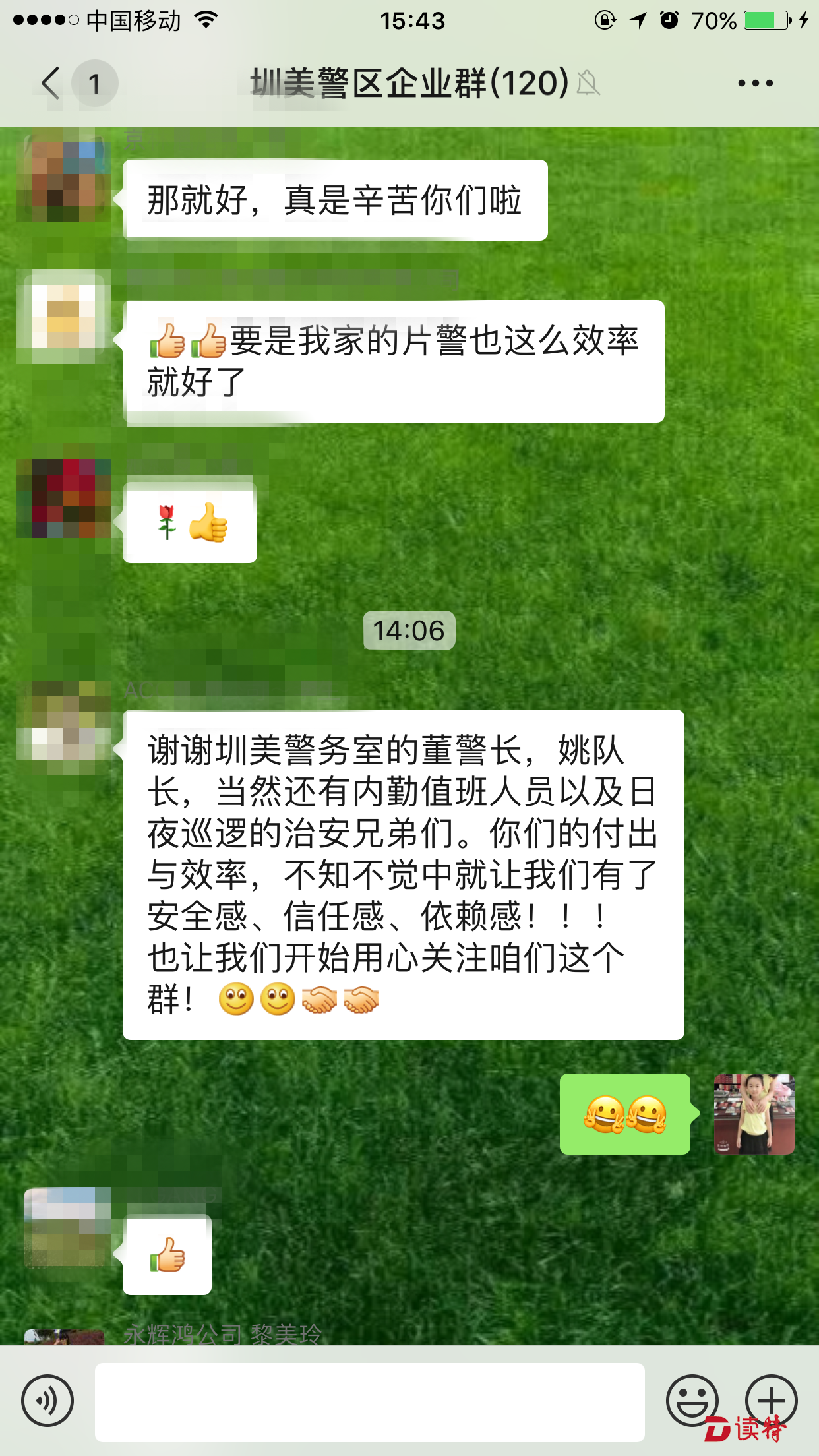 就在圳美警區(qū)隊(duì)員現(xiàn)場(chǎng)處置的過程中,微信群中的成員紛紛詢問事件情況。在了解到圳美警務(wù)室的隊(duì)員不到1分鐘就趕到現(xiàn)場(chǎng)后,大家對(duì)警區(qū)工作人員接連點(diǎn)贊。(讀特記者 王茂程 通訊員 胡澤瑜 溫小龍)