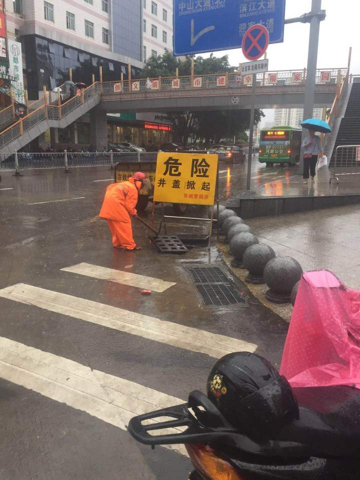 市城管部門已加派工作人員,加班加點(diǎn),打開華怡路口等易澇點(diǎn)井蓋并設(shè)置警示牌,加大對市區(qū)排水的力度。