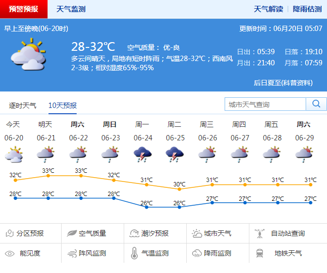 預(yù)計(jì)中考期間(6月22日至24日)天氣炎熱,部分時(shí)間有雷陣雨。其中,20日至22日多云炎熱,23日至24日多云間陰天,有雷陣雨,提醒考生做好防暑降溫準(zhǔn)備。