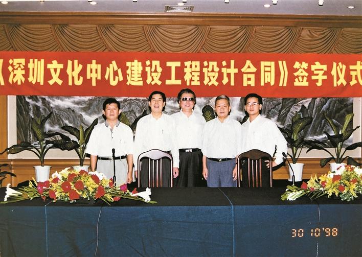 譚嗣英(左三)出席《深圳文化中心建設(shè)工程設(shè)計(jì)合同》簽字儀式。