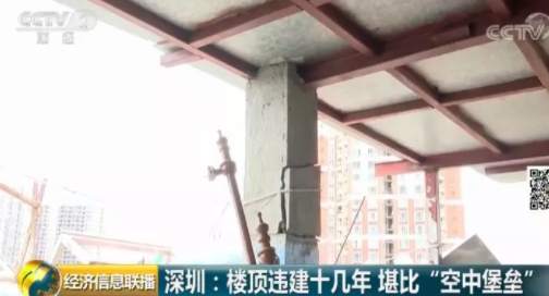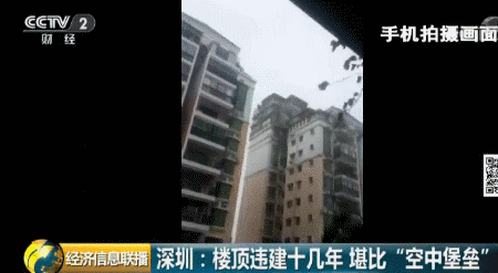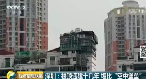 深圳福田區(qū)一個(gè)小區(qū)的居民日前爆料稱,小區(qū)一位業(yè)主違規(guī)在天臺上加建了幾層樓,遠(yuǎn)遠(yuǎn)看去就像一個(gè)“空中堡壘”,曾經(jīng)有人差點(diǎn)被上面掉落的鋼筋砸中,如此醒目的違建,已經(jīng)存在了十幾年。