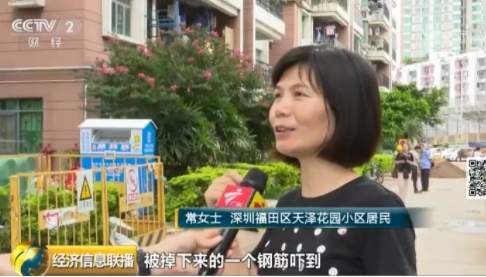 深圳福田區(qū)天澤花園小區(qū)居民常女士:我自己本人曾經(jīng)就在這下邊,被掉下來的一個(gè)鋼筋嚇到,當(dāng)時(shí)離這個(gè)鋼筋掉下來的位置就只有兩米遠(yuǎn)。