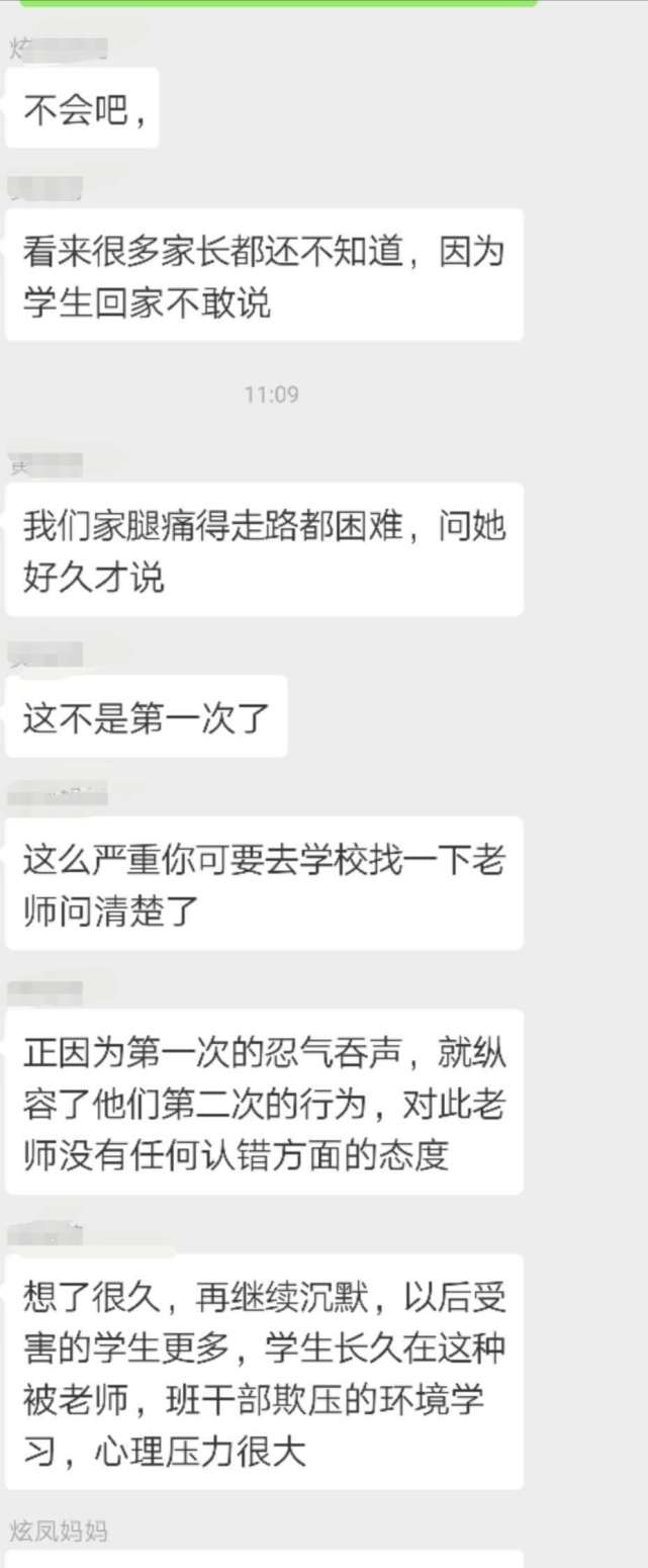王先生把女兒的情況反映到家長群里,結(jié)果群里的家長紛紛表示,自己的孩子也反映當(dāng)天遭遇到班長的毆打,有的孩子甚至“腿疼得難以走路”。而據(jù)孩子反映,其實類似的毆打在班上已經(jīng)不止發(fā)生過一次。這名班長是女生,平時很受班主任的信任,經(jīng)常利用班干部的權(quán)力隨意懲罰學(xué)生?!八?jīng)多次要求班上同學(xué)給自己帶零食吃,不然就會被撕作業(yè)和毆打,還威脅不準(zhǔn)告訴家長?!蓖跸壬Q,家長們已經(jīng)將情況反映給班主任,但是班主任的反應(yīng)“相當(dāng)冷淡”,只是說會了解一下情況。25日下午,記者電話聯(lián)系到了王先生女兒的班主任,他表示已經(jīng)就此事對班長進行了批評教育,但對于班長此前多次毆打同學(xué)的行為他表示并不知情,“當(dāng)初讓這名同學(xué)做班長是因為她成績好,而且守紀(jì)律。而且我覺得,孩子之間有些矛盾很正常。”班主任說。(記者 李東明)