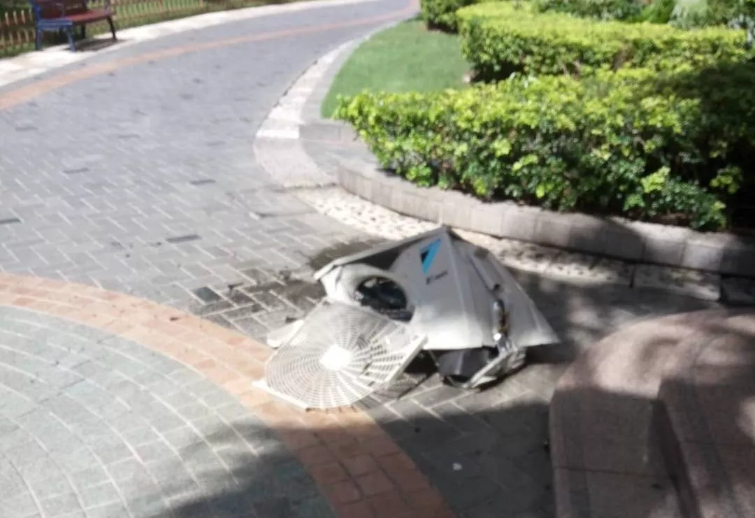 ▲高空掉落砸壞變形的空調(diào)外機