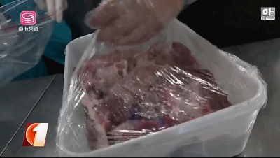 △執(zhí)法人員和檢測人員來到該餐廳后廚隨機(jī)挑選肉品進(jìn)行檢測