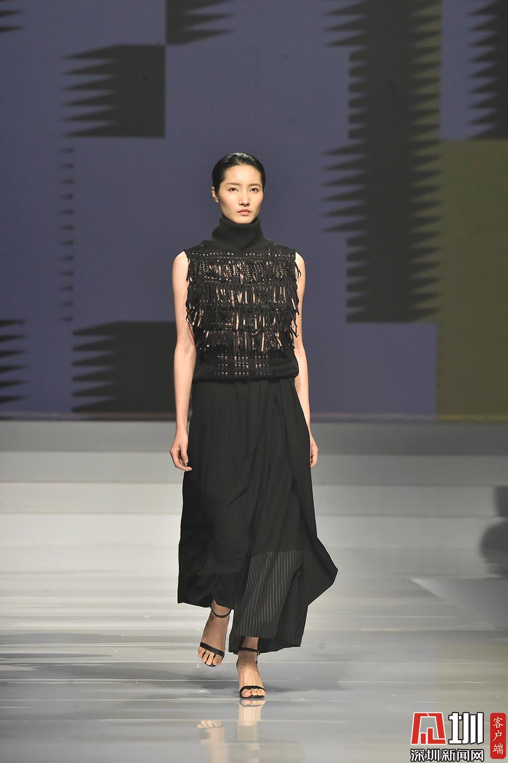 時裝優(yōu)秀學(xué)生組展示環(huán)節(jié),設(shè)計師肖榕作品,其作品以純黑色系為主