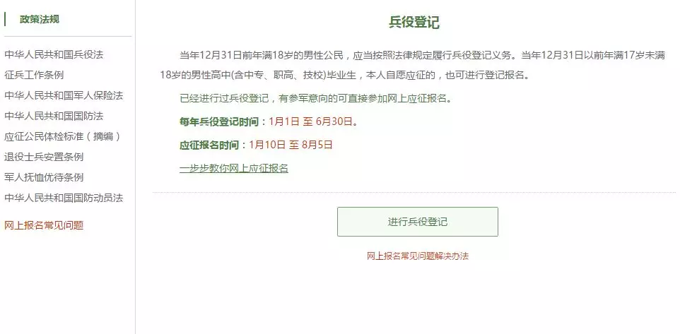 在這個(gè)頁面中,會(huì)告知我們報(bào)名時(shí)間以及參軍的政策說明,建議看后,點(diǎn)擊“進(jìn)行兵役登記”,邁出你軍旅生涯的第一步吧!