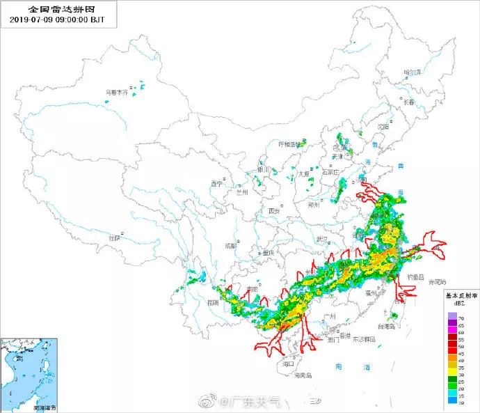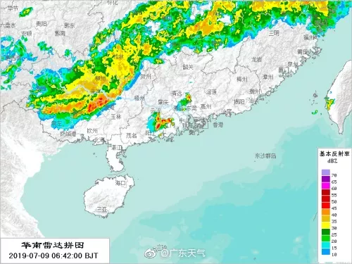 從今天早晨的雷達(dá)圖可見,廣東周邊省份已被狹長(zhǎng)的降雨云帶控制,降水相當(dāng)激烈。另外,珠三角西側(cè)也有雷雨云團(tuán)生成。