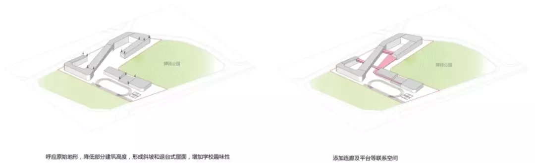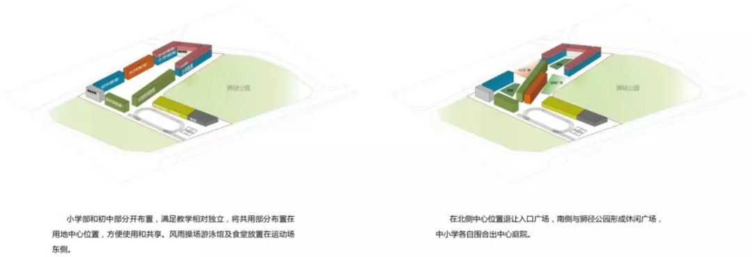 規(guī)劃采用了S型的布局關(guān)系,初中部和小學(xué)部各置一側(cè),各自有相對獨(dú)立的院落空間的同時(shí),能夠照顧到空間的流通性,使得二者能夠方便地共享公共教學(xué)設(shè)施。