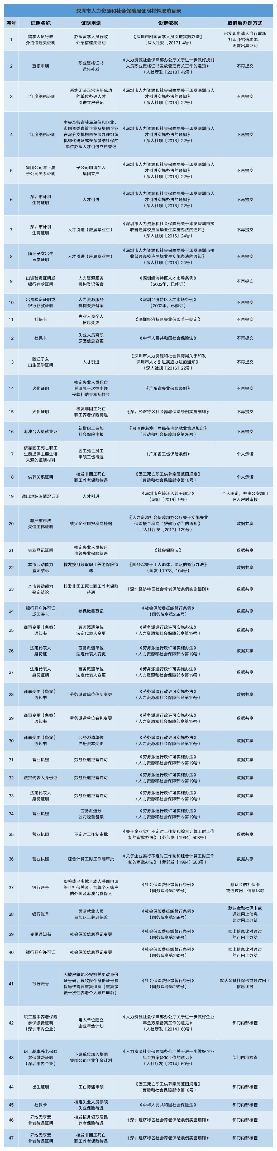 深圳新聞網(wǎng)2019年7月25日訊(見(jiàn)圳客戶端、深圳新聞網(wǎng)記者 施冰冰)據(jù)“深圳人社”微信公眾號(hào)消息,為了減證便民、優(yōu)化服務(wù),深圳市人力資源和社會(huì)保障局取消了47項(xiàng)證明材料。其中包括新增職工參加社會(huì)保險(xiǎn)申報(bào),港澳臺(tái)人員就業(yè)證不用再提交;人才引進(jìn)(應(yīng)屆畢業(yè)生),深圳市計(jì)劃生育證明、隨遷子女出生醫(yī)學(xué)證明無(wú)需再提交;勞務(wù)派遣單位法定代表人變更,法定代表人身份證、商事變更(備案)通知書(shū)等實(shí)現(xiàn)數(shù)據(jù)共享等等等等……