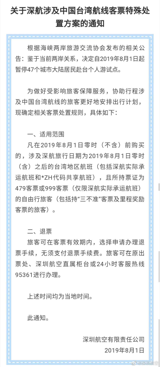深圳航空剛剛率先發(fā)布了關(guān)于深航涉及中國(guó)臺(tái)灣航線(xiàn)客票特殊處置方案的通知,凡在2019年8月1日零時(shí)(不含)前購(gòu)買(mǎi)的,涉及深航旅行日期為2019年8月1日零時(shí)(含)之后的臺(tái)灣地區(qū)航班(包括深航實(shí)際承運(yùn)航班和*ZH代碼共享航班),且所持票證為479客票或999客票(僅限深航實(shí)際承運(yùn)航班)的自由行旅客(包括持“三不準(zhǔn)”客票及里程獎(jiǎng)勵(lì)客票的旅客),旅客可在客票有效期內(nèi),選擇申請(qǐng)辦理退票手續(xù),無(wú)須支付退票手續(xù)費(fèi)。旅客可在原出票處、深圳航空直屬柜臺(tái)或24小時(shí)客服熱線(xiàn)95361進(jìn)行辦理。