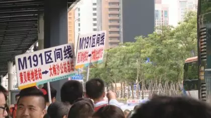 今天周六,準(zhǔn)備去往東部大小梅沙等景區(qū)的游客,擠滿了黃貝嶺公交站的站臺,巴士集團(tuán)的工作人員,也是手舉線路標(biāo)識牌,在站臺維持秩序。