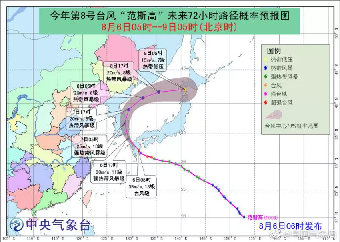 預(yù)計,“范斯高”將以每小時25-30公里的速度繼續(xù)向西北方向移動,將于今天晚上再次登陸韓國南部,爾后逐漸轉(zhuǎn)向東北方向移動,強(qiáng)度逐漸減弱。