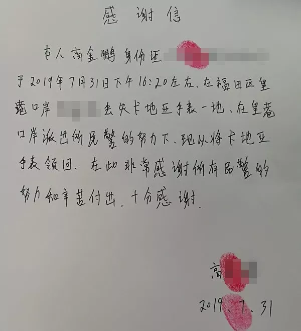7月31日,皇崗口岸派出所接到事主高先生報警稱,其17時許在皇崗口岸某處遺失一塊手表(購置價4萬余元)。巡段民警周剛迅速出警,將事主帶回派出所詢問情況,民警周元華通過大數(shù)據(jù)分析研判,發(fā)現(xiàn)遺失手表被一男子拾到,且該男子一直在原地等待失主并未離開。隨后,周元華將男子帶回派出所歸還失物,高先生向拾金不昧的好心人表示感謝,并給民警們寫下感謝信。