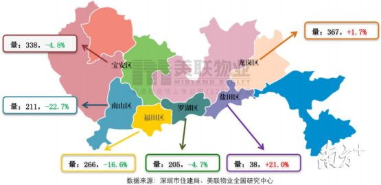 在成交格局方面,龍崗區(qū)與寶安區(qū)盡管成交量彼長此消,但是兩區(qū)成交量仍然保持前兩名的格局。