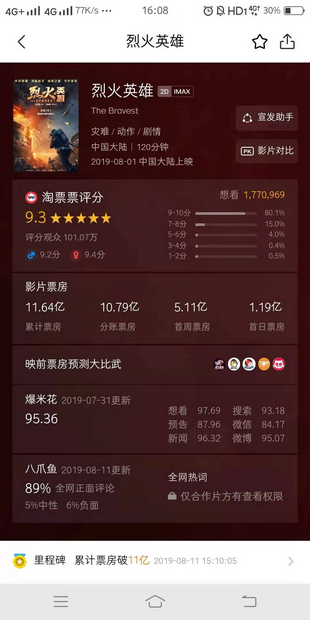 《烈火英雄》票房破10億 或成暑期檔國產(chǎn)真人電影票房冠軍